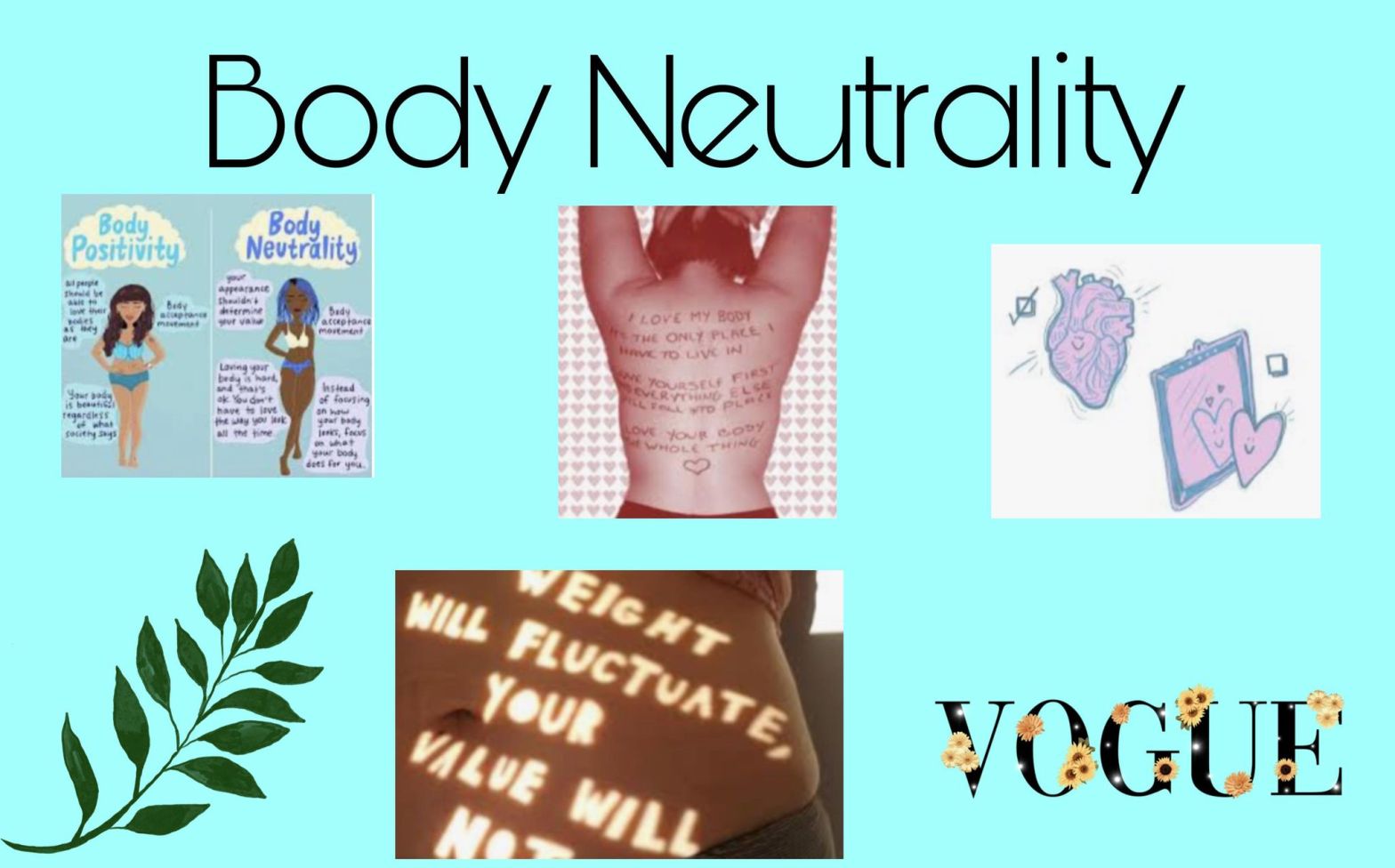 Body neutrality relates to a “social movement” that “centres marginalised bodies and emphasies that all bodies are deserving of respect.” It focuses more on what the body is able to do, and as opposed to the body positivity movement, it tells people that while they might not necessarily have to love the apperience of their bodies all of the time, they can still give their bodies the love and respect that they deserve. This includes eating a healthy amount to fulfil one’s bodies needs, allowing your body to rest and not giving your body hate because of how it looks.